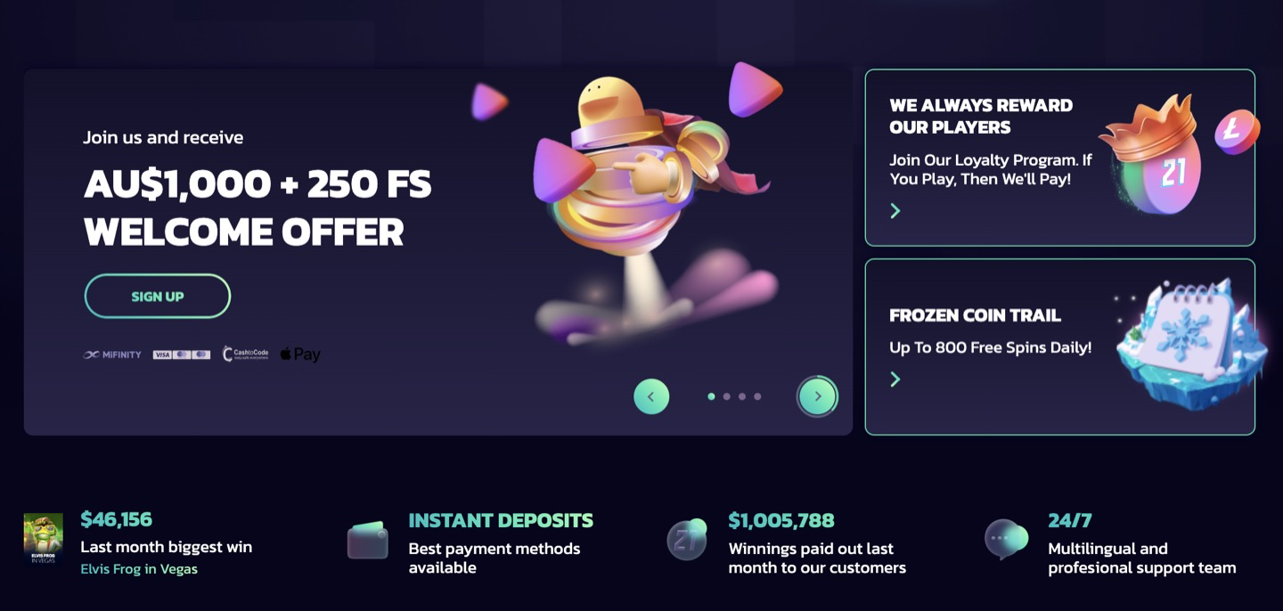 Australian players gain access to the global welcome package, typically listed in AU reviews as up to A$1000 + 250 free spins across the first several deposits. While the casino does not permanently advertise a classic 21bit casino no deposit bonus, players frequently receive no-deposit-style rewards via 21bit casino bonus codes, daily drops, loyalty missions, and free spin promos.